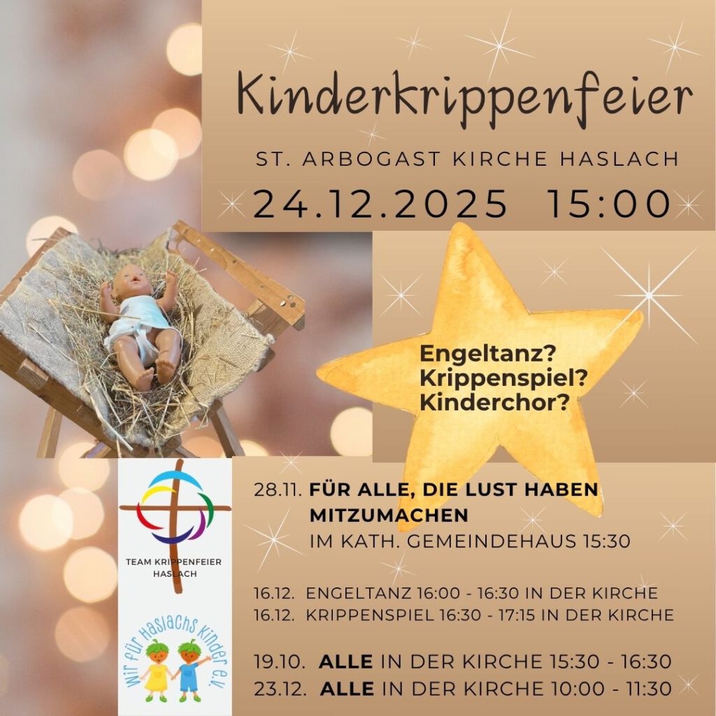 Am Heiligabend, 24. Dezember 2025 um 15:00 Uhr feiern wir gemeinsam die Kinderkrippenfeier in der St. Arbogast Kirche Haslach.