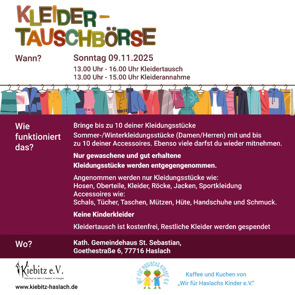 Am Sonntag, 09.11.2025 findet im Kath. Gemeindehaus St. Sebastian wieder die  Kleidertauschbörse statt!